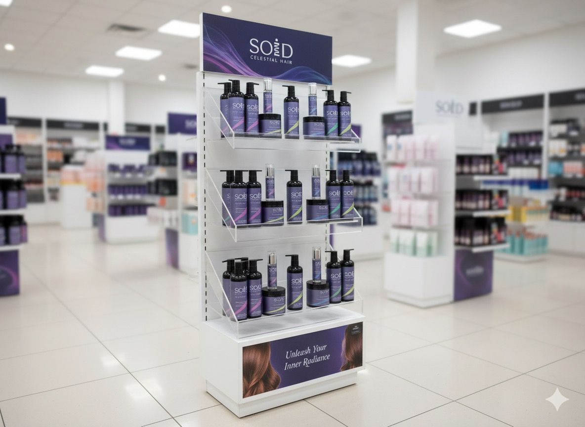 Destaca tu punto de venta con nuestro elegante mueble exhibidor diseñado especialmente para resaltar la línea profesional de Soid Celestial. Ideal para una presentación atractiva y ordenada que impulsa las ventas. -